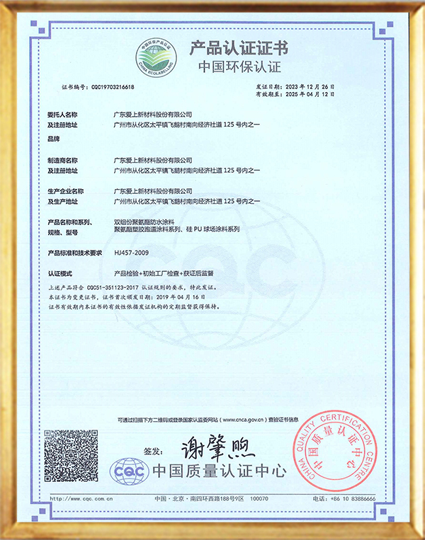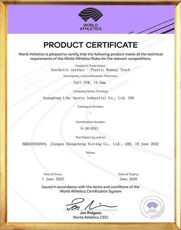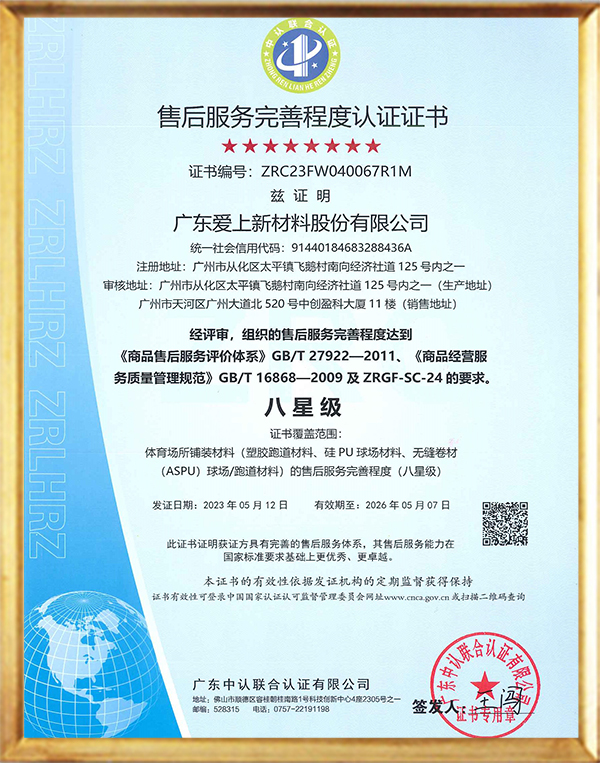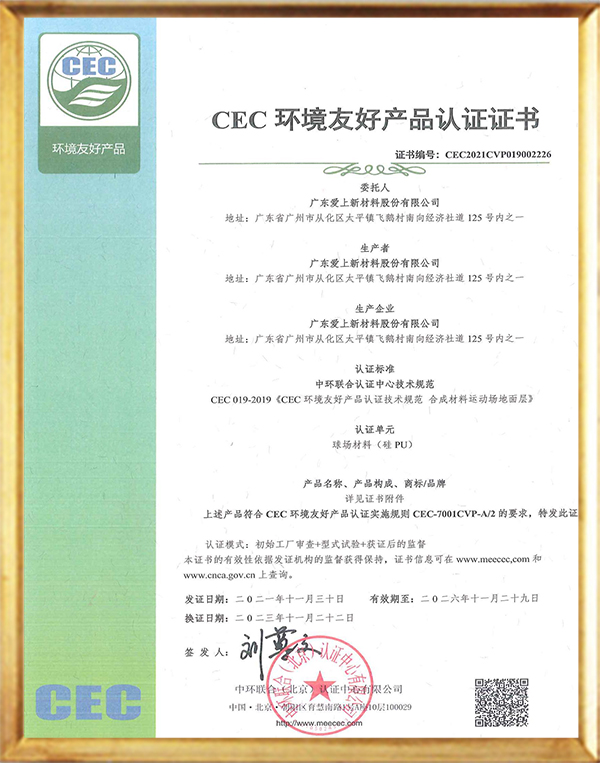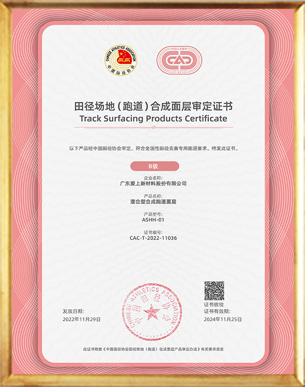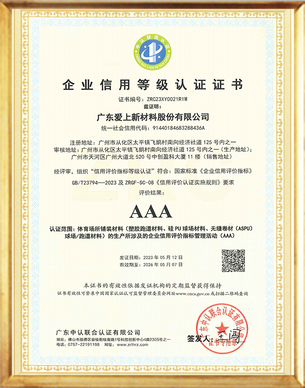 秉承“專心、專注、專創(chuàng)、專業(yè)”的工匠精神,公司累計(jì)獲得36項(xiàng)國家專利和近30項(xiàng)權(quán)威認(rèn)證。愛上體育的產(chǎn)品嚴(yán)格遵循GB36246-2018國家技術(shù)標(biāo)準(zhǔn),通過了ISO9001、ISO14001、ISO45001、中國環(huán)境標(biāo)志產(chǎn)品認(rèn)證、CQC中國環(huán)保產(chǎn)品認(rèn)證、NSCC國體產(chǎn)品認(rèn)證、世界田聯(lián)產(chǎn)品認(rèn)證、中國田徑協(xié)會審定產(chǎn)品(全塑型、混合型、無縫卷材全塑型跑道(半預(yù)制))等多項(xiàng)認(rèn)證,公司連續(xù)9年被認(rèn)定為國家高新技術(shù)企業(yè),榮獲“專精特性”企業(yè)稱號,并被政府及稅務(wù)機(jī)關(guān)評定為“守合同重信用企業(yè)”“A級納稅企業(yè)”。